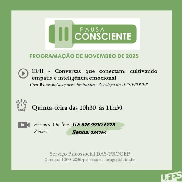 Convidamos a todos para participarem do encontro da Pausa Consciente deste mês de Novembro, com a Psicóloga Wanessa Gonçalves dos Santos, no formato remoto. Essa ação objetiva a dedicação de um tempo para o autocuidado tendo como foco a realização de práticas orientativas. Participe.